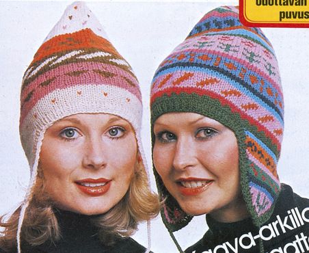 Viimeistely: Neulo reunajouste 2 osassa pitkillä puikoilla nro 3½. Neulo ensin takaosa. Poimi s:t toisen korvaläpän kärjestä toiseen ja neulo 1 o 1 n -joustetta 3 krs ja päätä s:t. Neulo etureuna samoin. Ompele jouste kiinni läppien kärjestä ja puno niihin 12 cm:n letit. Puno samanlainen letti myssyn huippuun. Höyrytä myssy kevyesti kostean liinan läpi.