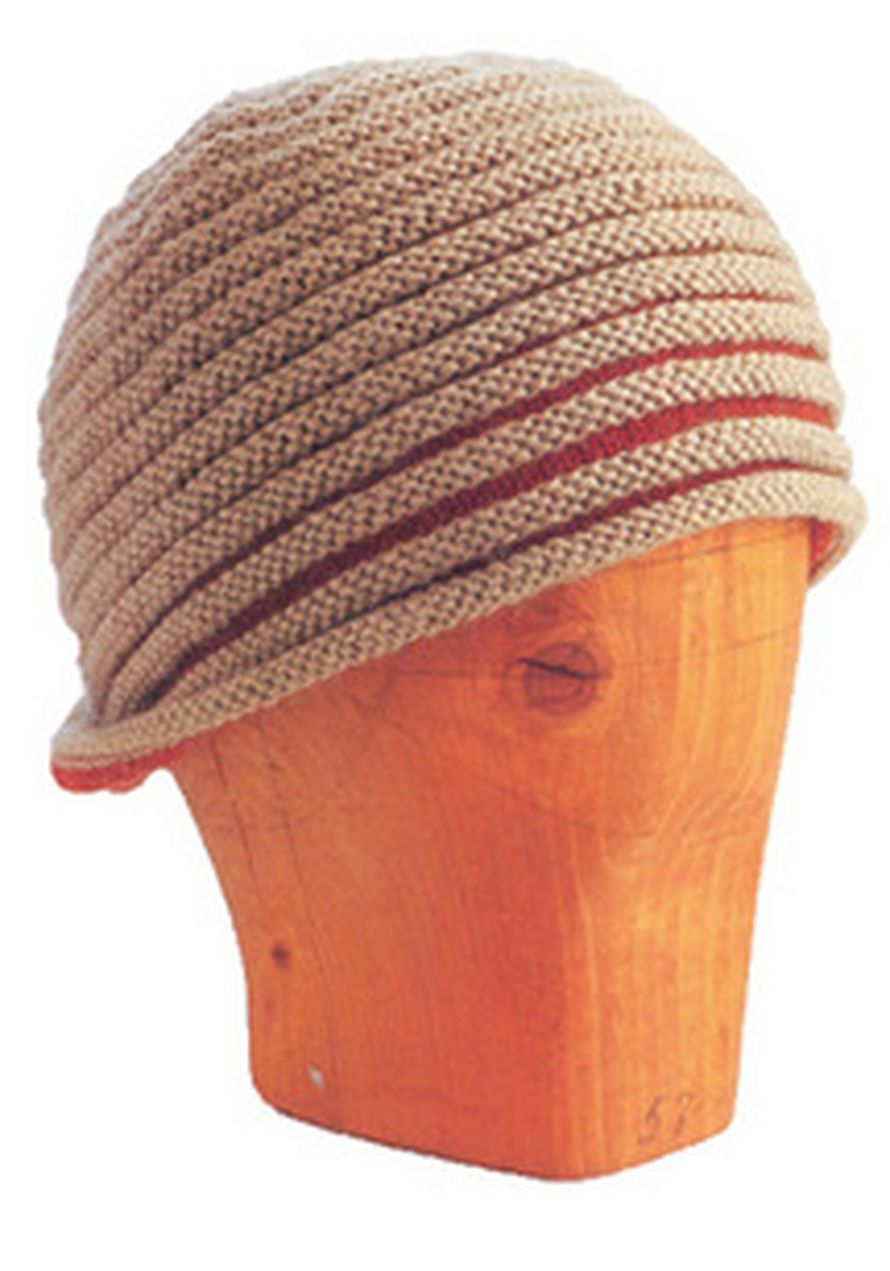 Kun työssä on 8 nurjaa raitaa, *neulo 2 krs oikein harmaanvihreällä ja sitten v.vihreällä 1 krs oikein ja 3 krs nurin*, toista *-* siten, että työhön tulee 4 harmaanvihreää raitaa. Muuta sitten harmaanvihreä lanka punaruskeaksi ja toista *-* kerran. Neulo jatkossa samoin kuin aiemminkin, mutta tee punaruskealla ensin 3 oikeaa krs:ta ja sitten kaksi kertaa 4 oikeaa krs:ta. Neulo viimeksi v.vihreällä 1 krs oikein 3 krs nurin, päätä s:t nurin. Kiristä pipon aloitus-krs umpeen ja päätä langanpäät.