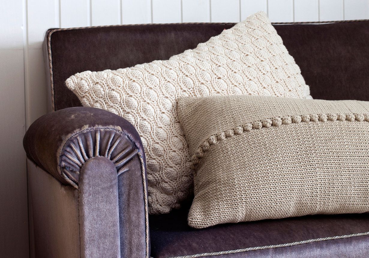 Neulo Hanko-langasta pitsineuleella tai virkatuilla pampuloilla koristeltu tyyny sohvallesi.