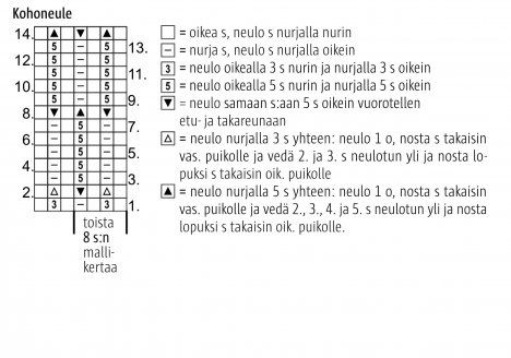 Tee seuraava eli nurjan puolen krs siten, että aloitat sen piirroksen vasemmasta ja toistat sitten mallikertaa 14 kertaa. 2. krs:lla työhön tulee 26 uutta silmukkaa ja työssä on nyt 115 s. Toista jatkossa ruutupiirroksen 3.–14. krs:ia. Kerroksilla 3.–7. työssä on 14 ”palloa” ja krs:illa 8.–14. on 15 ”palloa” eli kohoneuleen aikana silmukkaluku on välillä joko 115 tai 119 s.