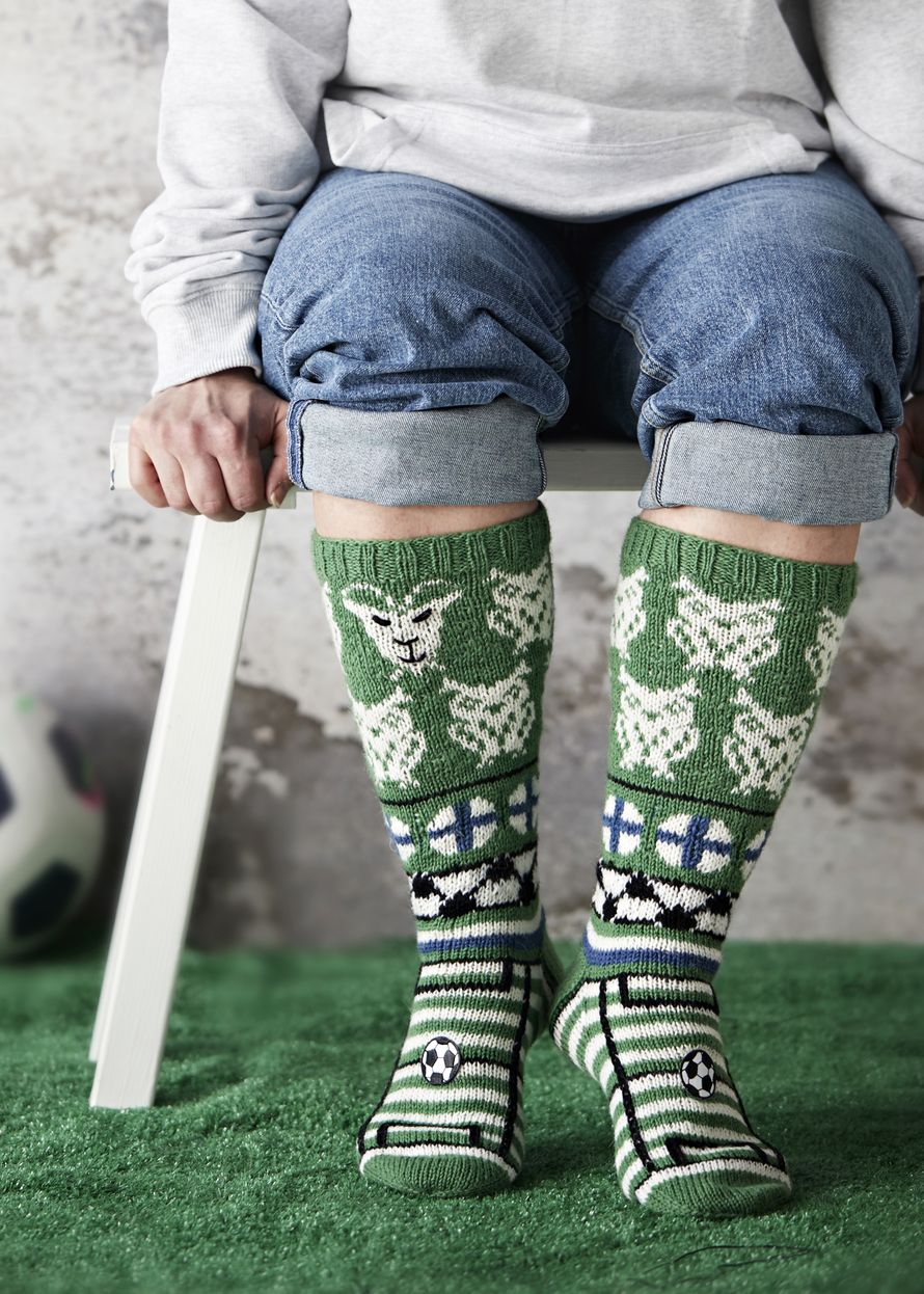 Tsemppiä, Huuhkajat! Suuri Käsityö tarjoaa Huuhkajien kannatussukkien ohjeen ilmaiseksi kaikille futisfaneille. Huomaatko, missä myös Pukki piilottelee?