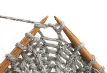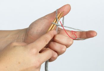 11. Nurja silmukka: Tuo lanka oikean puikon eteen. Pistä oikea puikko vasemman puikon silmukkaan oikealta vasemmalle.