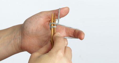 5. Tuo etusormen lanka peukalon lankalenkistä. Päästä peukalon lenkki ja kiristä silmukka puikolle.