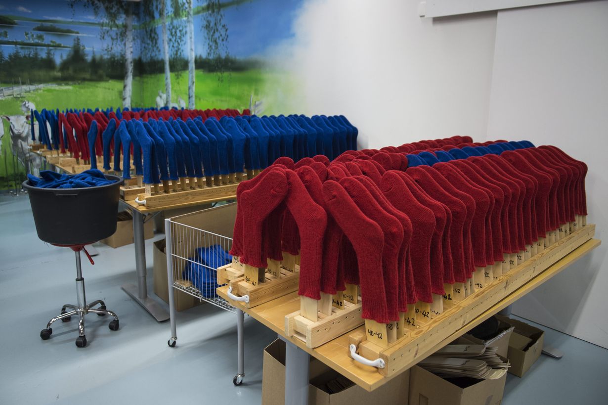 ”Käytämme villasukkien valmistukseen lähes satavuotiaita koneita. Ne toimivat loistavasti, mutta eroja niissä on: joku on hitaampi kuin toinen, jollekin taas sattuu enemmän virheitä. Sama pätee työntekijöihin.