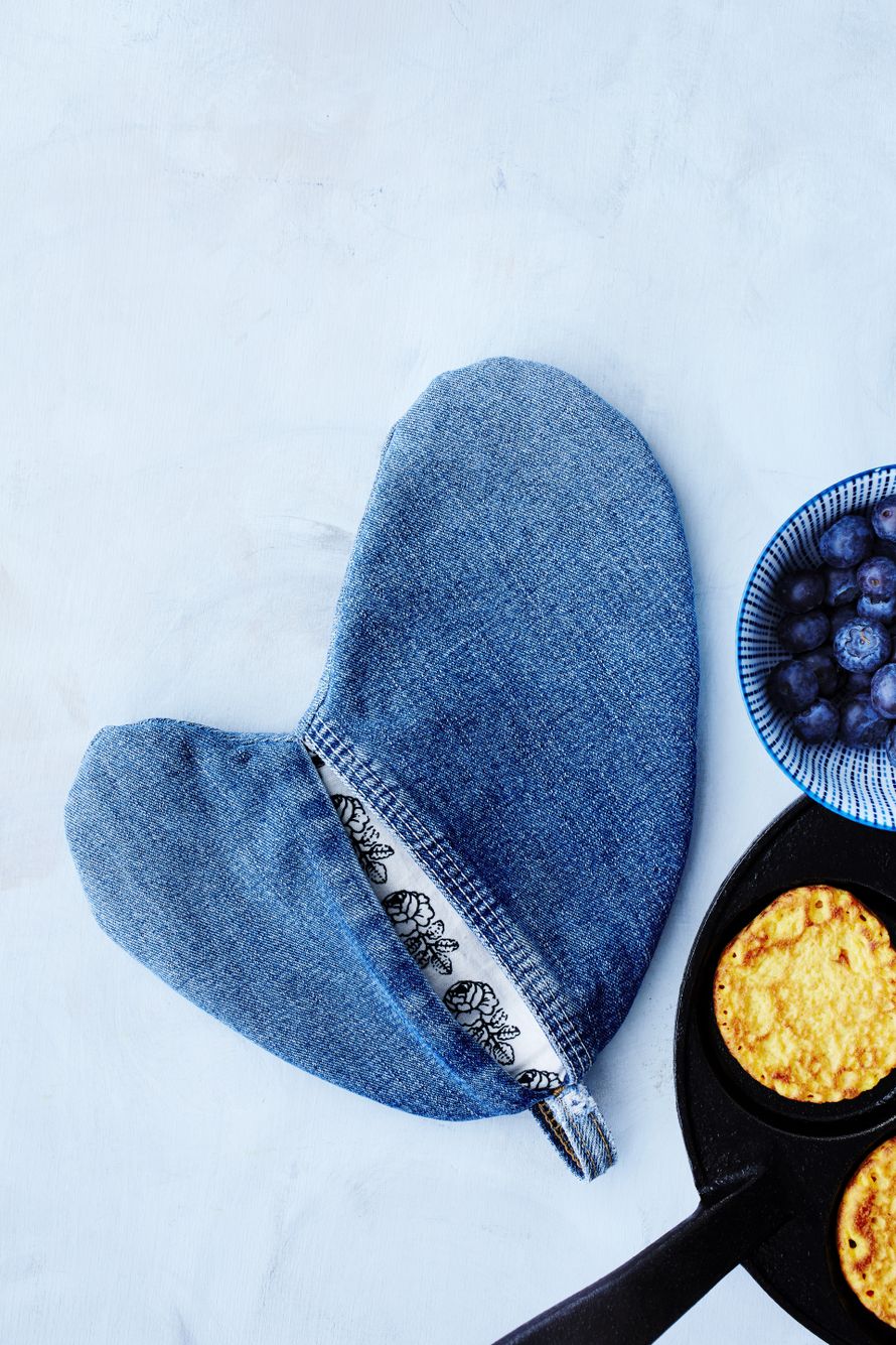 Laura Lantto kierrätti vanhat farkut patakintaaksi, joka suojaa myös grillaajan näpit.