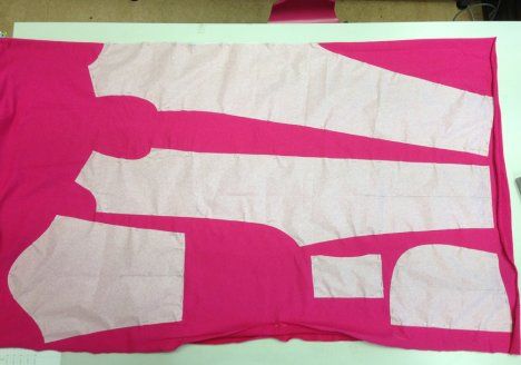 4. Taita taskun ylä-, sivu- ja alareunoista saumanvarat nurjalle. Aseta tasku etukappaleelle merkkien mukaan, taskun ja etukappaleen etureunat kohdakkain. Tikkaa tasku etukappaleeseen kaksoisneulalla. Harsi tasku etukappaleen etureunaan.