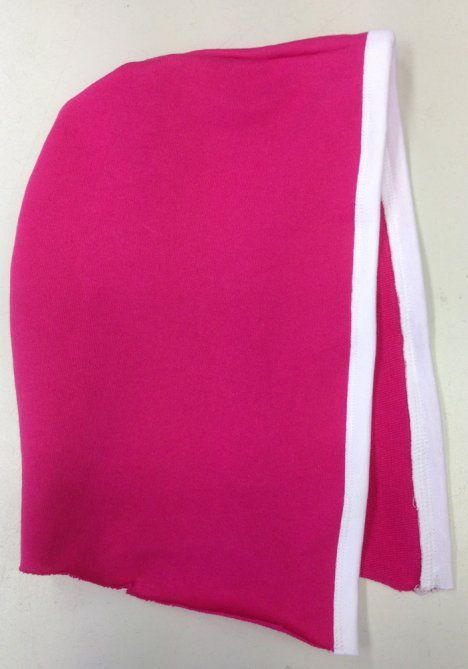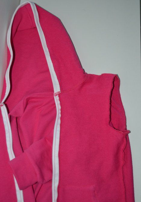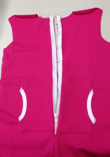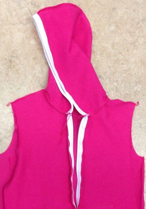 6. Ompele hupun keskisauma. Huolittele hupun etureuna valkoisella resorikaitaleella kuten taskunsuut, leikkaa resori pari senttiä hupun reunaa lyhyemmäksi.