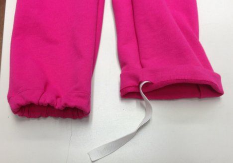15. Huolittele lahkeensuut. Taita lahkeensuun päärme nurjalle, ompele kaksoisneulalla siten, että syntyy kuja kuminauhalle, mutta jätä aukko kuminauhan pujotusta varten. Pujota kuminauha kujaan, tarkista pituus ja ompele kuminauhan päät yhteen.