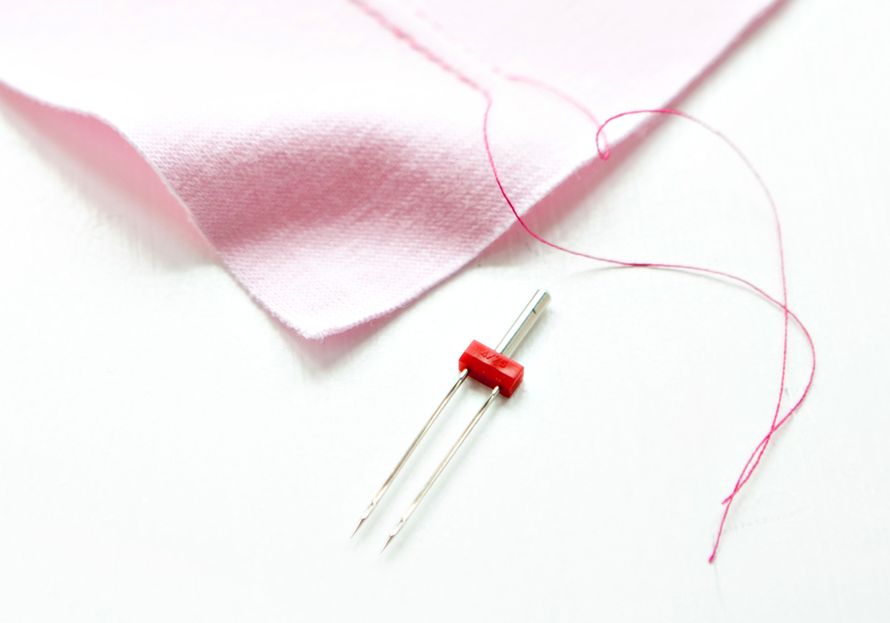 Kaksoisneulalla ompelet siistit ja joustavat päärmeet trikoo- ja neulosvaatteisiin. Ompeleessa näkyy oikealla puolella kaksi ommelta rinnakkain ja nurjalla niiden välissä siksakommel, joka samalla huolittelee reunan.