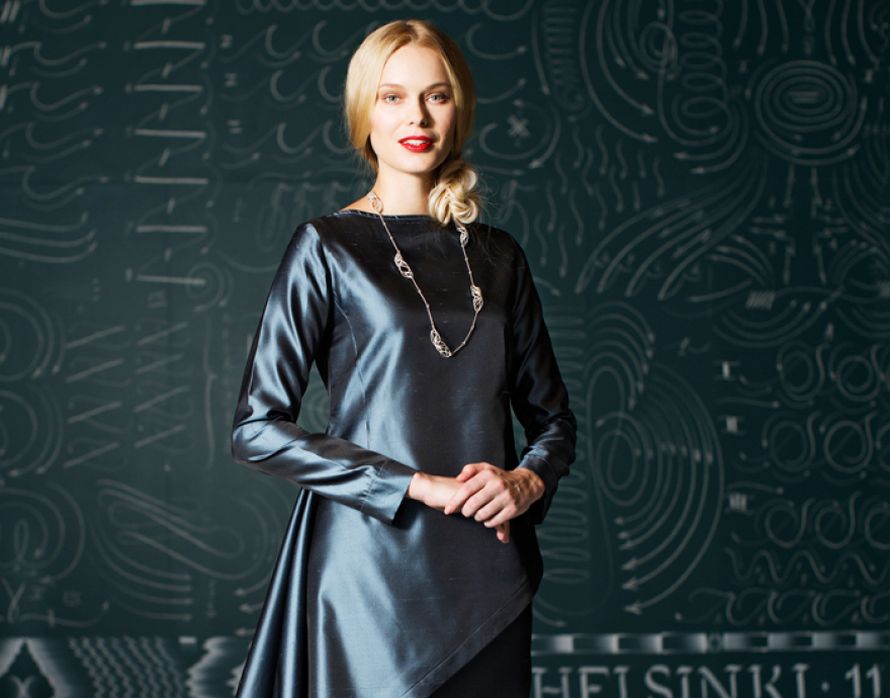 Ilonan arkkitehtitausta näkyy silkkiasun yksinkertaisissa muodoissa ja mittasuhteiden harmoniassa. Ohje Suuri Käsityö 1/2014.