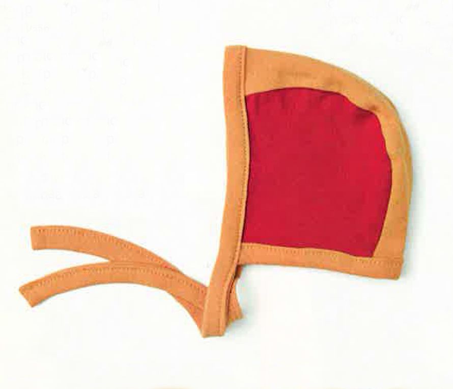 Tarvikkeet: Trikoota päälakikappaleeseen ja nauhoihin noin 30 cm, sivukappaleisiin 20 cm toista väriä, leveydet 150 cm. Reunojen huolitteluun trikoota tai valmista trikoovinokaitaletta 85 cm.