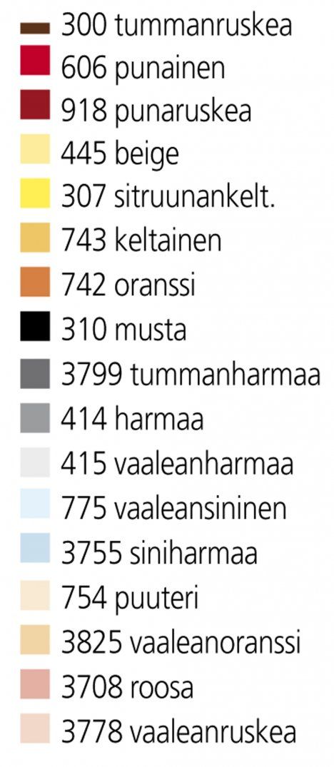 Tarvikkeet: 24x35 cm:n pala luonnonvalkoista miniaidakangasta, tiheys 5,5 pistoa/cm. DMC:n muliinilankoja 17 väriä ruutupiirroksen viereisen listan mukaan. Tylppäkärkinen neula.