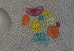 Kirjo kukkien terälehdet linnunsilmäpistoilla ja ompele keskelle solmupistot. Turkoosi pilkutus on helppo tehdä etupistoin.