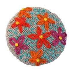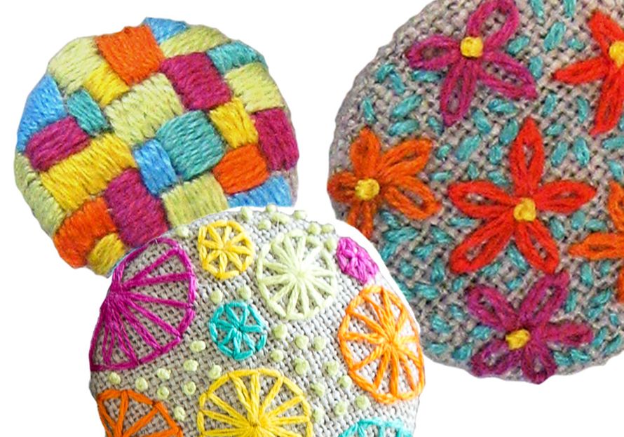 Tee näin: Piirrä kankaalle ympyrä nappipohjapakkauksessa olevan kaavan avulla. Kirjo ympyrän sisään kuvioita mallien tai mielesi mukaan. Mallit tavallisimpiin kirjontapistoihin löydät täältä. Jätä reunat kuvioimatta, sillä kangas kääntyy reunoista napin alle.
