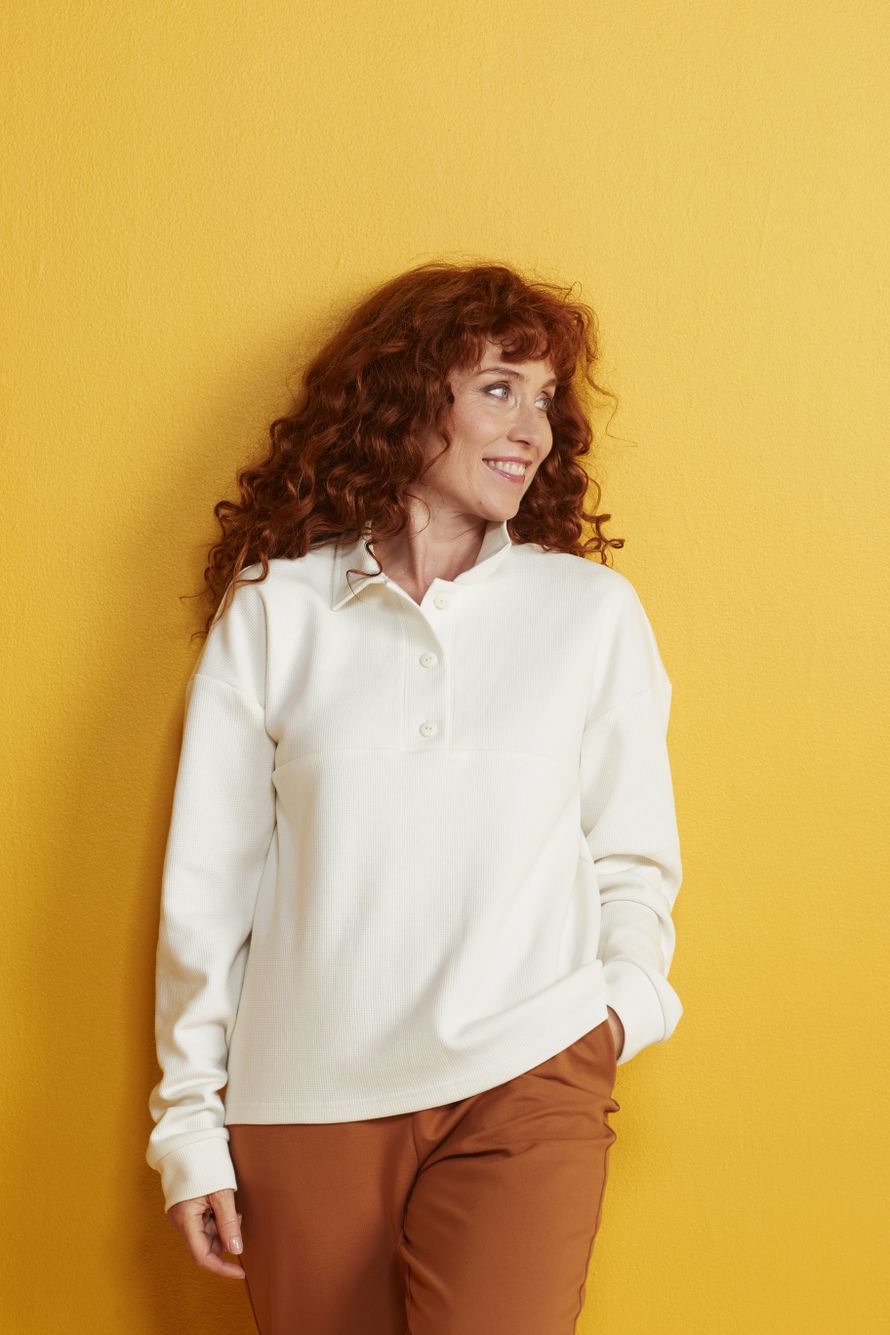 Ompele kaulus pääntielle ei-tuettu puoli paidan oikeaa vasten, kauluksen reunat asettuvat napistuslistojen keskelle KE-linjaan.