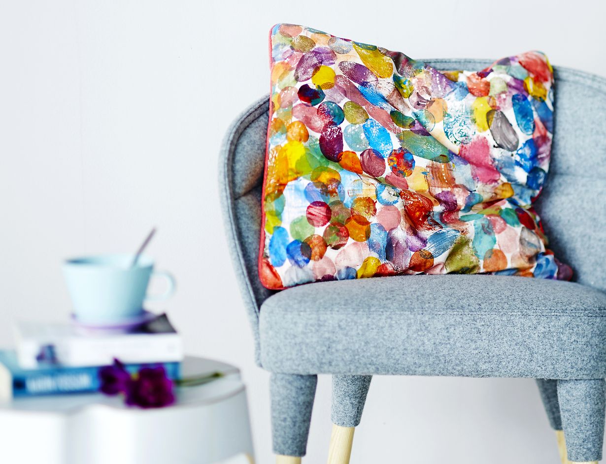 Krista Kangas-Lahtinen painoi kankaan kirjavaksi perunoilla ja surautti siitä värikkään tyynyn.
