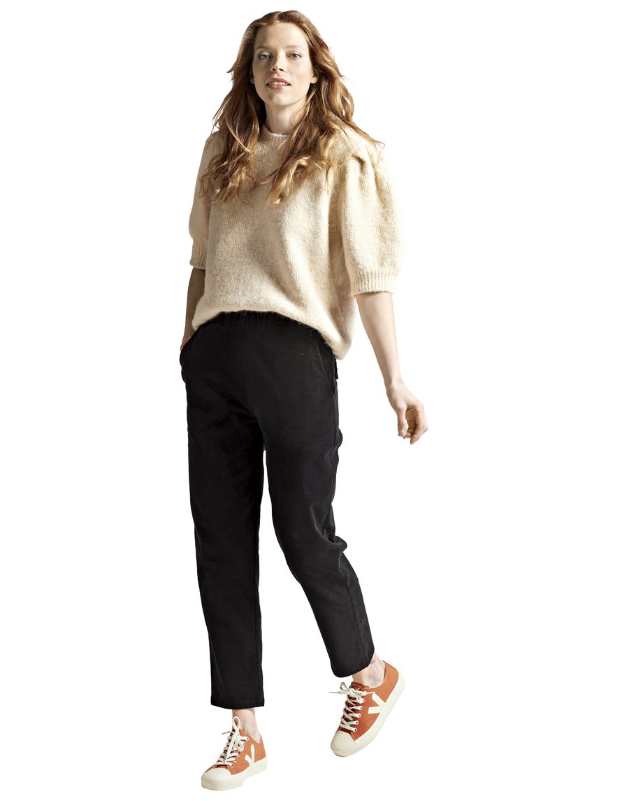 Muka Van Tyyne-housut (8) voi ommella joustavasta tai joustamattomasta kankaasta. Vyötärökaitale leikataan joustamattomasta kankaasta hieman pidempänä kuin ohjeessa.