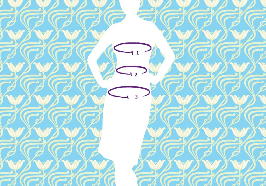 Vyötärön ympärys (2): Kiinnitä vyötärölle tukeva nauha, ota mitta nauhan päältä.