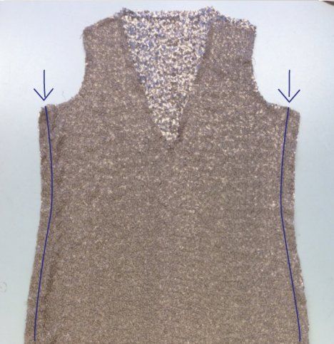 2. Aseta etu- ja takakappaleet vuorin kanssa oikeat vastakkain. Ompele päänteiden reunat yhteen. Ompele samoin kädenteiden reunat yhteen, mutta jätä saumoja auki noin 4 cm edessä ja takana olan vierestä. Tee aukileikkauksia saumanvaroihin ja edessä v-kulmaan.
