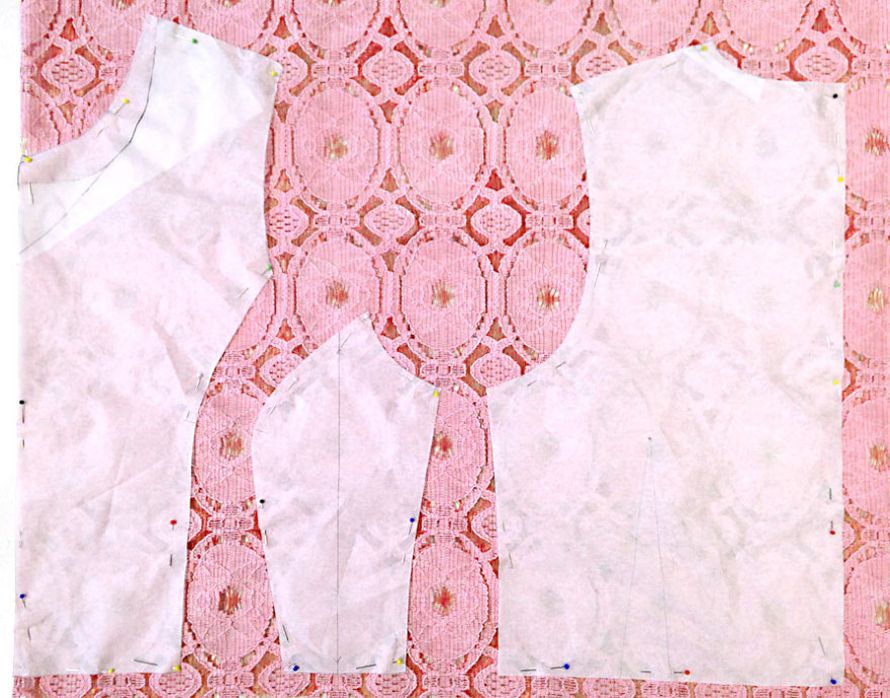 Leikkaa kaksinkertaisesta pitsikankaasta etu-, etusivu- ja takakappale. Leikkaa etukappale taitteelta.