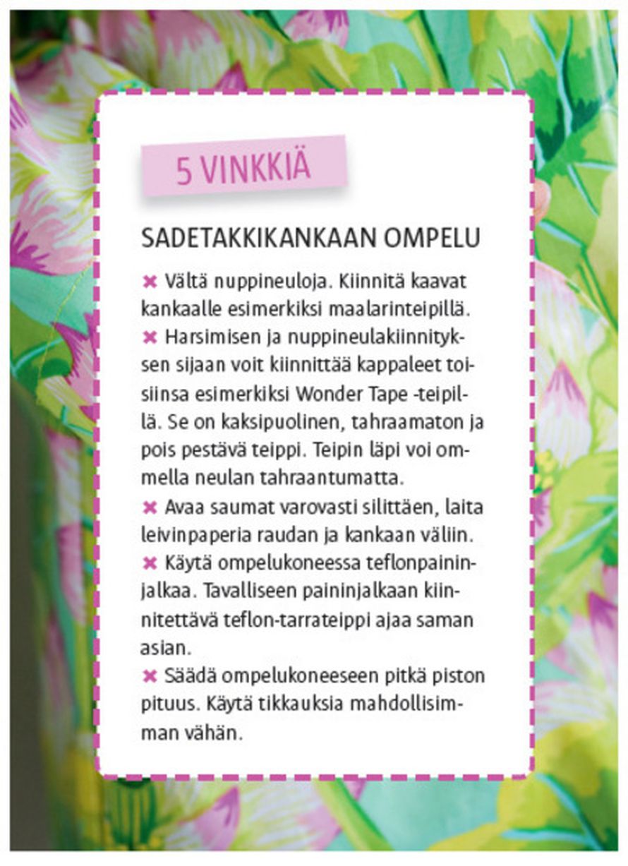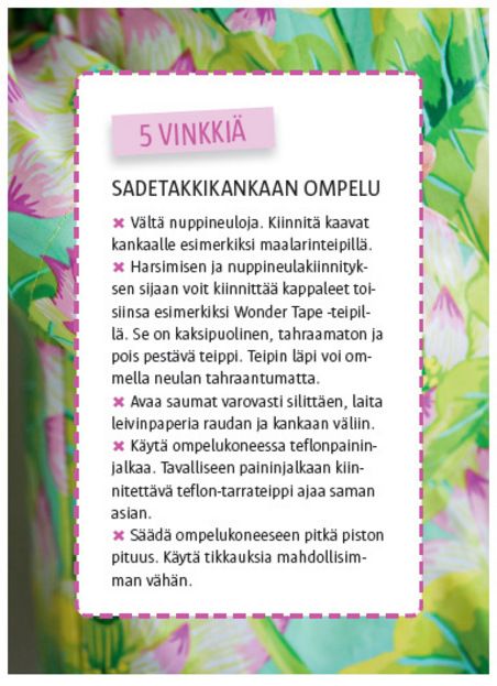 Tee itse |Ompelu Näin ompelet sadetakkikangasta 26.8.2012 klo 14:06 Pienten niksien avulla onnistut sadetakin ompelussa! Tilaa Kodin Kuvalehti Suuri Käsitylö 03/2010 Ompelu neuvo tekniikka sadetakki Tilaa Lue digilehtenä