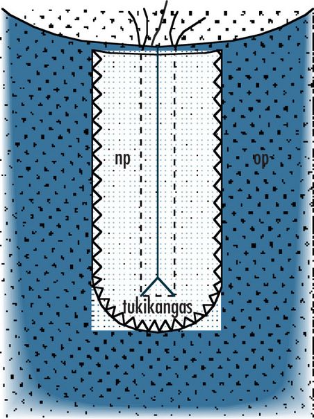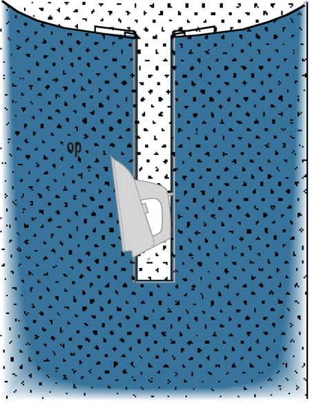 1. Huolittele alavaran ulkoreunat. Aseta alavara kappaleelle oikeat puolet vastakkain. Ompele halkioreunat (ompeleiden väli 1–1,5 cm) suoraompeleella. Leikkaa halkio keskeltä auki .