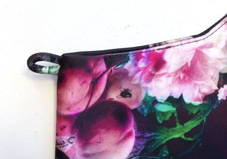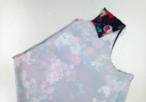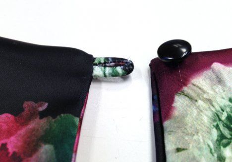 6. Käännä kappale oikein päin pujottamalla takakappaleet olan kautta etukappaleen puolelle. Käännä kädenteillä ja pääntiellä saumanvarat alavarojen alle ja tikkaa oikealta puolelta läheltä ommeljuovaa saumanvarat kiinni alavaroihin.
