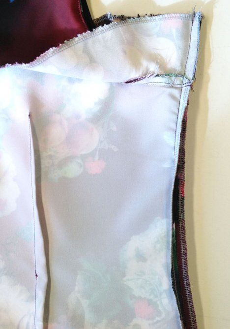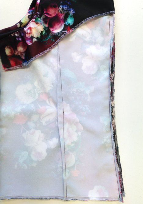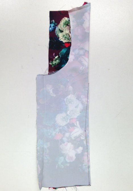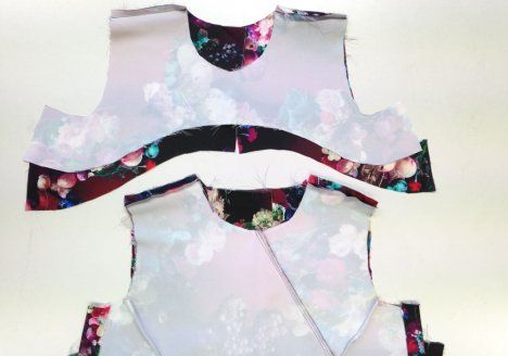 5. Aseta alavarat etu- ja takakappaleelle oikeat vastakkain. Ompele pääntien reuna, takahalkion reunat ja kädenteiden reunat. Tee aukileikkauksia saumanvarojen kaareviin kohtiin ja ohenna kulmat.