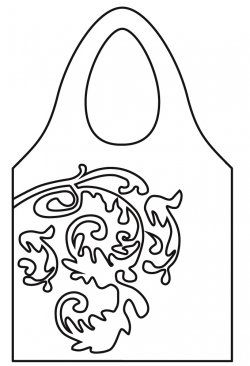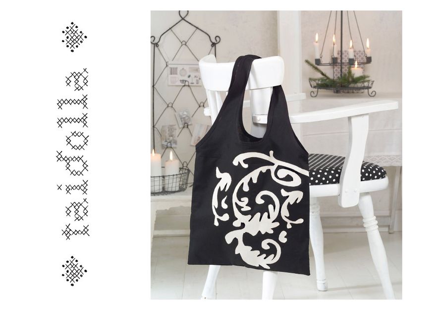 Jäljennä koukerokuvio liimaharson paperipuolelle. Silitä harso valkoisen kankaan nurjalle puolelle ja leikkaa kuvio ääriviivoja pitkin. Poista paperi ja silitä kuvio toiseen mustaan kassikappaleeseen. Ompele koukero kankaaseen aivan kuvion reunoja pitkin valkoisella langalla, kapealla siksakilla.