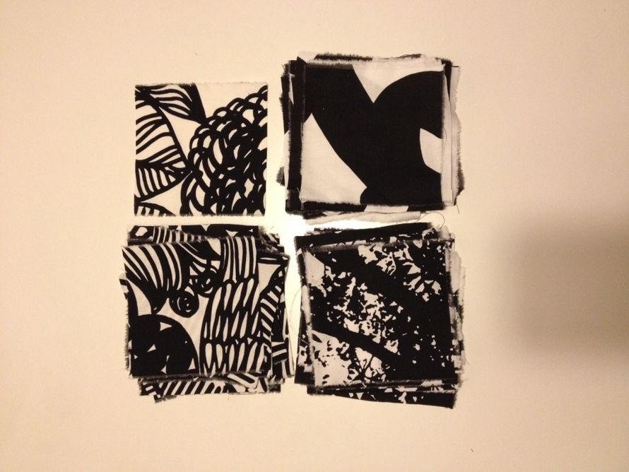 Ompelimme tyynynpäällisen tekemällä asetelman Marimekon mustavalkoisista kankaista. Monen kuosin yhteensovittamiseen tämä yksinkertainen neliötilkkumalli sopii hyvin. Tekniikka on nopea ja helppo: katso vaihekuvat yltä.