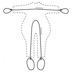 9. Taivuta rautalanka kaareksi piirroksen mukaan ja pujota se kaula-aukon kautta jalkoihin. Tee rautalangan päihin lenkit, jotka ovat hieman pienemmät kuin kengät. Täytä jalat ja vartalo kainaloihin asti vanulla. Pujota rautalanka käsien väliin ja tee päihin lenkit, jotka mahtuvat käsineisiin. Täytä kädet ja vartalon yläosa kaulaan asti vanulla.