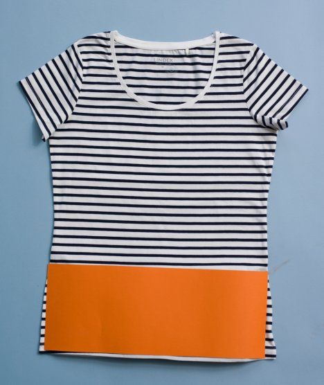 Leikkaa kartongista (kuvassa oranssia) suorakaiteen muotoinen pala, joka on yhtä leveä kuin paidan helma ja jonka korkeus on sama kuin peplumin haluttu korkeus (valmiissa työssä 17 cm).