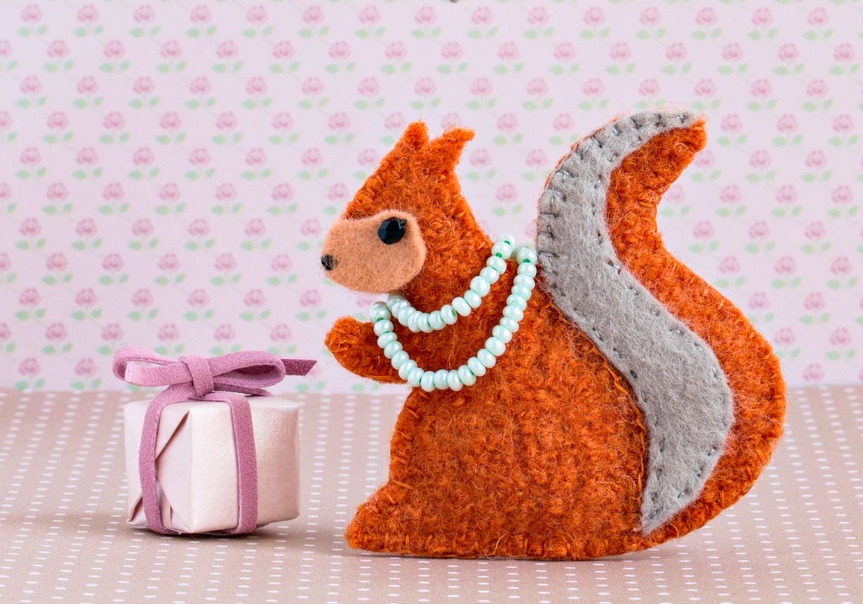Tulosta oravan kaava tästä tai sivun alareunassa olevasta linkistä. Leikkaa punaruskeasta huovasta 2 x vartalo niin, että toisessa kappaleessa on vain vasen korva ja toisessa oikea. Leikkaa persikanvärisestä huovasta naama ja harmaasta hännän vasen reuna.