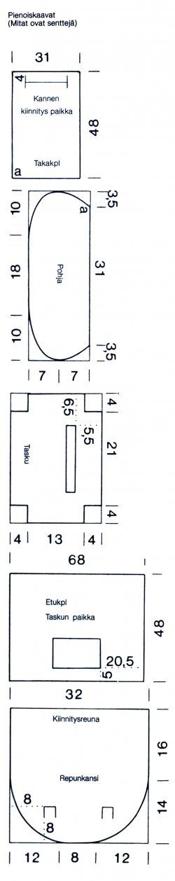 Ompele kansikpl:t yhteen. Ompele ulkoreunaan puuvillanauha. Taita 18 cm pitkiä solmimisnauhoja varten puuvillanauha kaksinkerroin Ja ompele kanteen merkkien mukaan. Poimuta valmis kansi 20 cm pitkäksi ja ompele takakpl:lle merkin mukaan. Ompele kiinnityssauman päälle puuvillanauha. Kiinnitä siihen samalla ripustin ja 80 cm pitkät kaksinkertaiset olkahihnat.