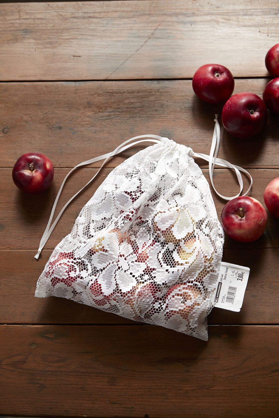 Siirry muovittomaan aikaan ja ompele kauppareissulle mukaan hedelmäpussit kierrätysmateriaaleista. Pusseista kaunein syntyy pitsiverhosta.