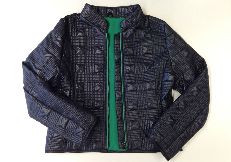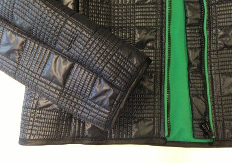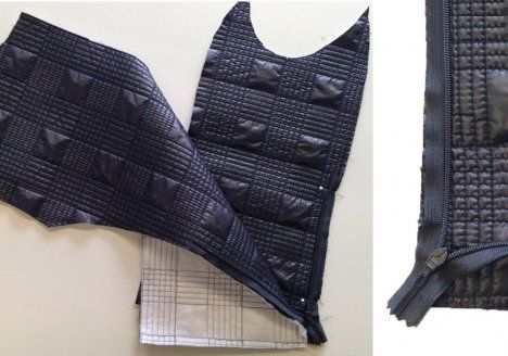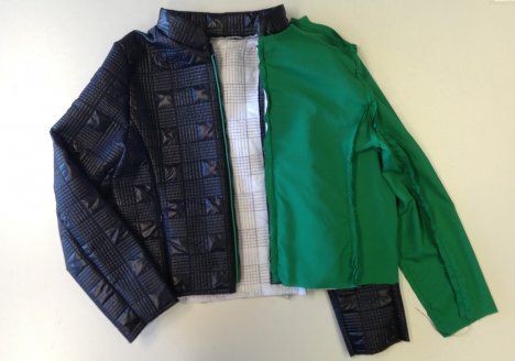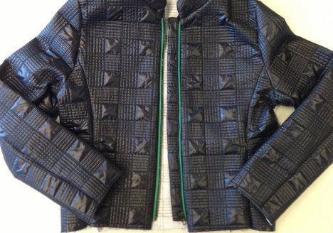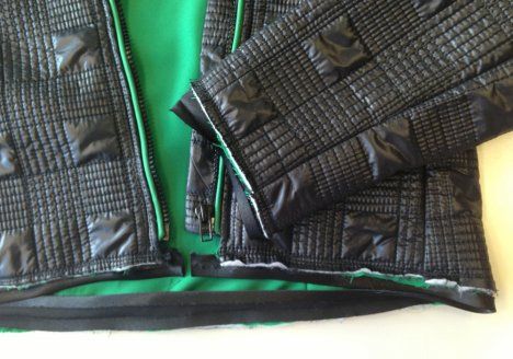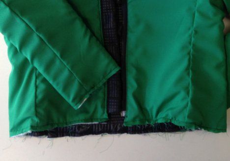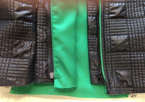 15. Aseta jakku ja vuori oikeat vastakkain ja aseta vetoketjut etureunoihin vuorin ja päällisen väliin. Ompele etureunat ja käännä samalla saumanvarojen puolelle tereiden päät ja pääntiellä vetoketjun päät.