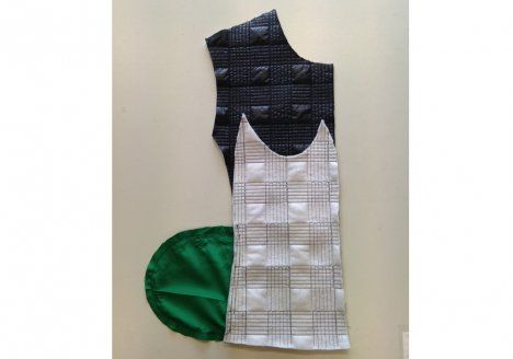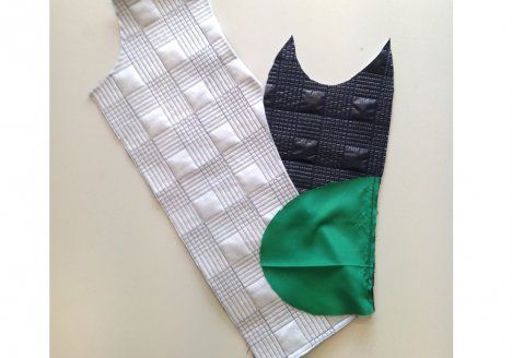 Tarvikkeet: Mustaa tikkikangasta 1,20(1,20)1,25(1,30)1,30(1,30)1,30 m, vihreää vuorikangasta 1,20(1,20)1,25(1,25)1,25(1,25)1,25 m, leveydet 140 cm, kokoon 34 45 cm:n avovetoketju, muihin kokoihin 50 cm:n avovetoketju (lyhenä vetoketjua yläpäästä sopivaan mittaan), kaksi piilovetoketjua, pituus 15 cm, satiinivinokaitaletta 1,80-2,20 m ja vihreää terettä 1,10 m. Kiinnisilitettävää tukikangasta.