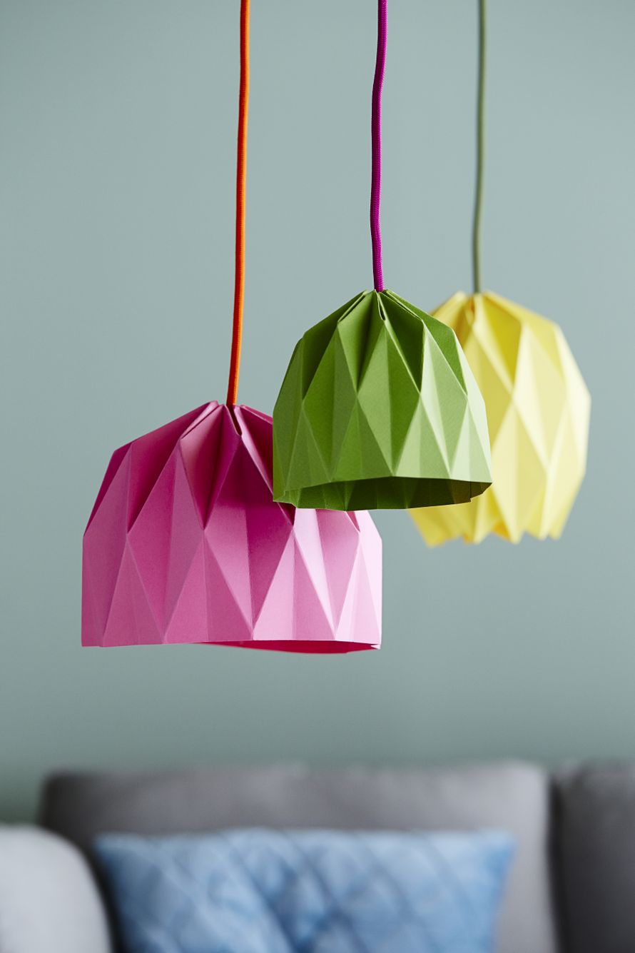 Tee itse origamivarjostimet, jotka suodattavat valon pehmeäksi. Samalla kaavalla voit tehdä monta erilaista varjostinta. Vaihtele kokoa, väriä ja kuosia!