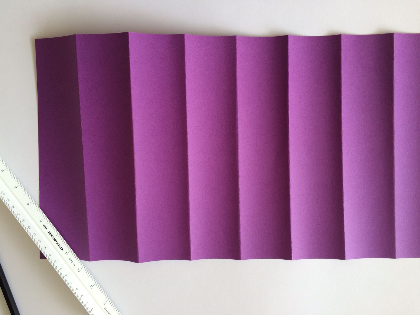 1. Leikkaa 160-grammaisesta kartongista haluamasi kokoinen suorakulmio. Kuvan varjostin on tehty 25 x 63 cm:n kokoisesta kartongista. Aseta kartonki vaakatasoon. Merkitse pystysuorien taitosten kohdat kartonkiin lyijykynällä 3 tai 2 cm:n välein. Taita suorat taitokset niin, että kartongista tulee haitari. Tee taitoksista tarkat ja napakat. Voit napakoittaa taitokset viivottimen tai taitosterän avulla.