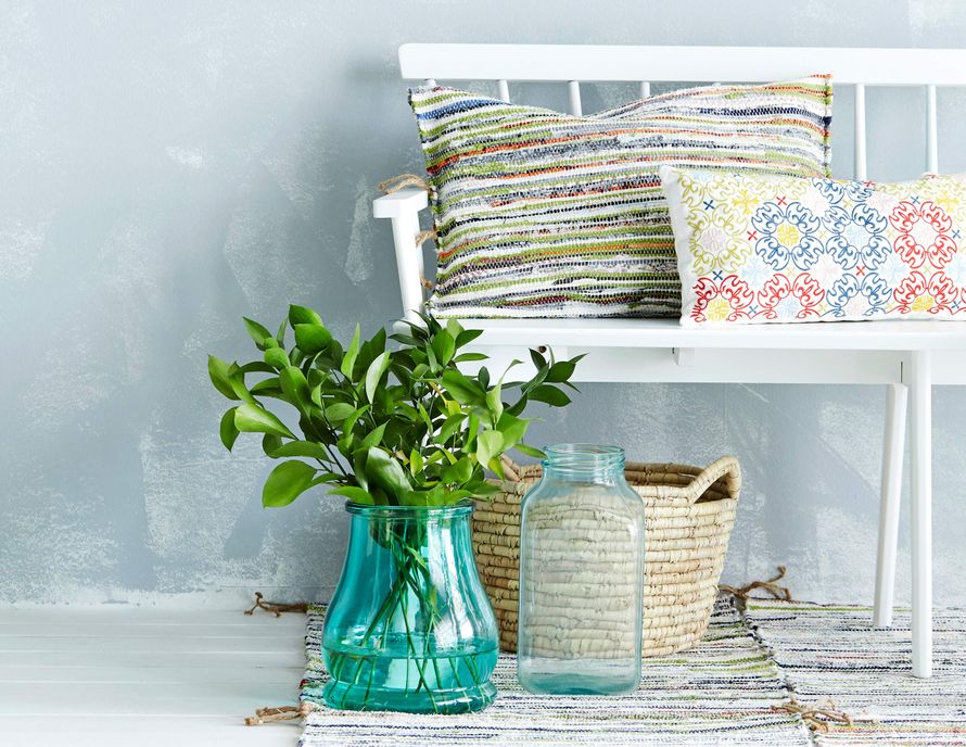 Ompele vanhoista, notkeiksi astutuista räsymatoista kesäiset mökkityynyt, joita voit huoletta käyttää terassilla tai vaikka rantakalliolla.