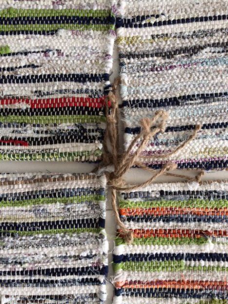 Neljästä pienestä räsymatosta saat yhden suuremman, kun ompelet ne yhteen nurkan hapsuista. Halutessasi voit harsia matot yhteen reunoistaan.