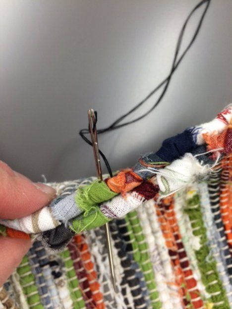 Ompele maton päät kiinni suorilla pistoilla. Ompeleet häviävät näkyvistä värikkäiden matonkuteiden sekaan, joten voit ommella ronskisti isoilla pistoilla ja mustalla langalla.