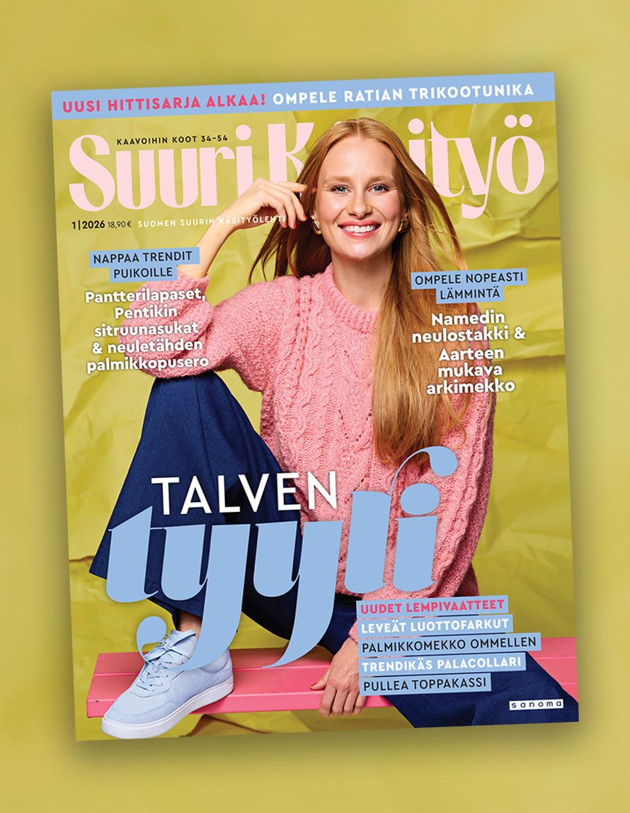 Tee itse Tammikuun lehti on julkaistu! Tutustu numeron SK 1/26 malleihin videolla. Suuri Käsityö Kuvat Piia Arnould 7.1.2026 klo 10:00 Vuoden ensimmäinen lehti on täynnä talven tyylikkäimpiä käsitöitä! Katso lehden kaikki mallit oheiselta videolta. Katso video: 4822650 Tilaa Suuri Käsityö Suuri Käsityö SK mallisto Tilaa Lue digilehtenä