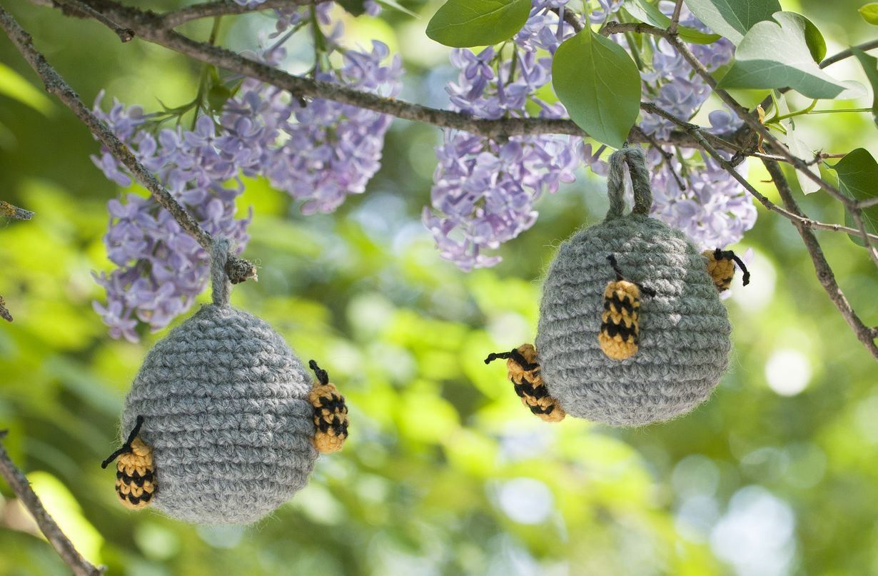 Viimeistely: Ompele ampiaiset muutamilla pistoilla pesään. Solmi sitten pätkät mustaa lankaa ampiaisten tuntosarviksi. Tee lankojen molempiin päihin solmut n. 1 cm:n päähän tyvestä ja katkaise langanpäät solmujen vierestä.