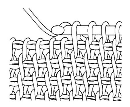 3: Poimi s:t koukulle eli vie koukku edellisen kerroksen s:n pystyosan takaa, vedä lanka koukulla silmukaksi, toista koko krs.