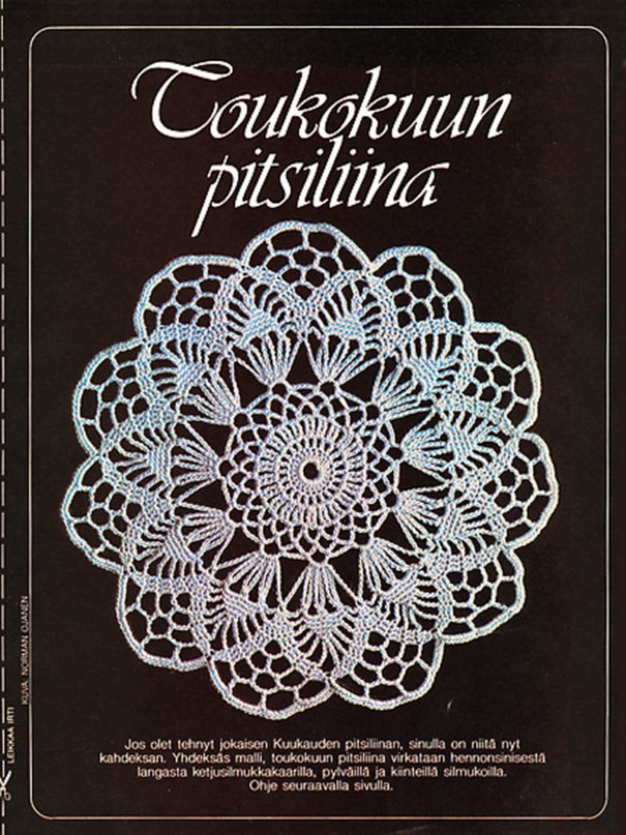 Pitsiliinojen sarjaa julkaistiin vuonna 1982 kuukausittain Suuri Käsityö -lehdessä. Suloinen pikkuliina houkuttaa yhä tarttumaan koukkuun.