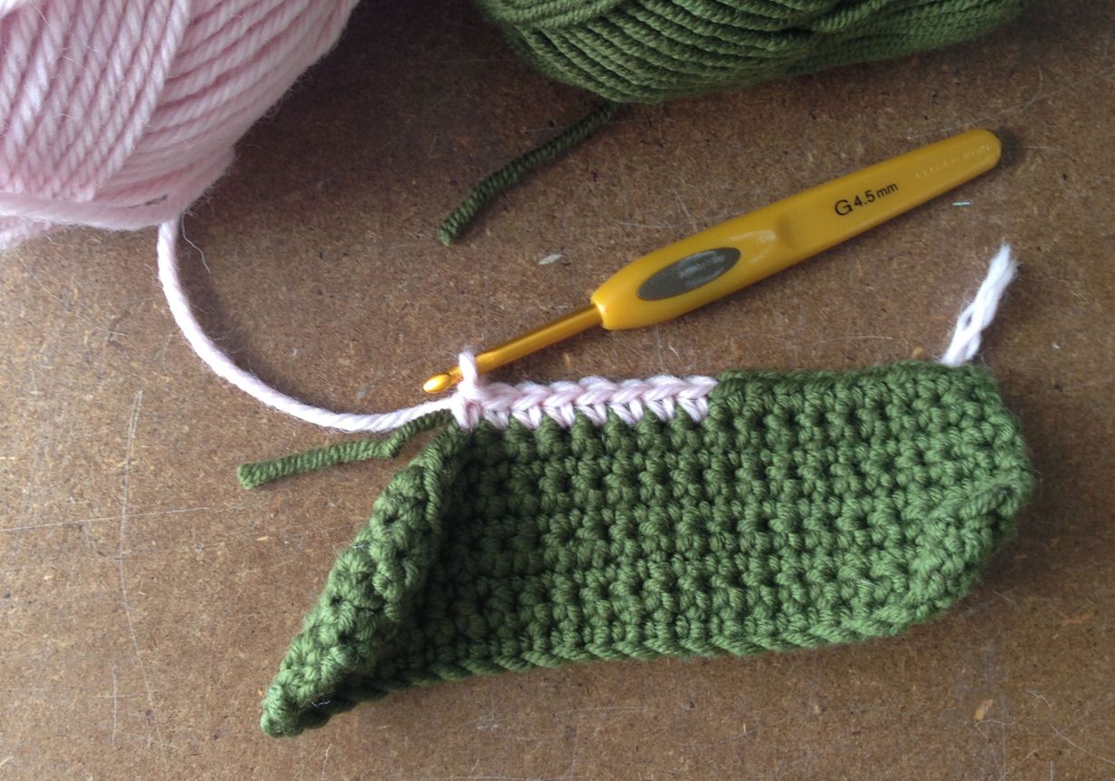 3. Aseta vanha lanka edellisen kerroksen silmukoiden päälle ja jatka virkkaamista uudella langalla. Vanhan langan pää jää piiloon silmukoiden sisälle. Virkkaa näin 5 - 8 silmukkaa tai niin kauan kuin langanpäätä riittää.