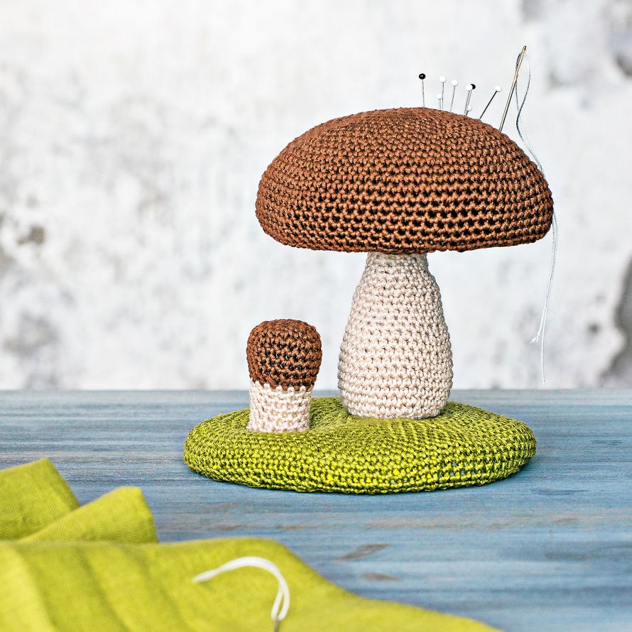 Sienineulatyynyn ohjetta voi muokata mielensä mukaan. Voit virkata vain yhden sienen lakin ja tehdä muut osat puusta. Puuosia voi myös päällystää kankaalla.