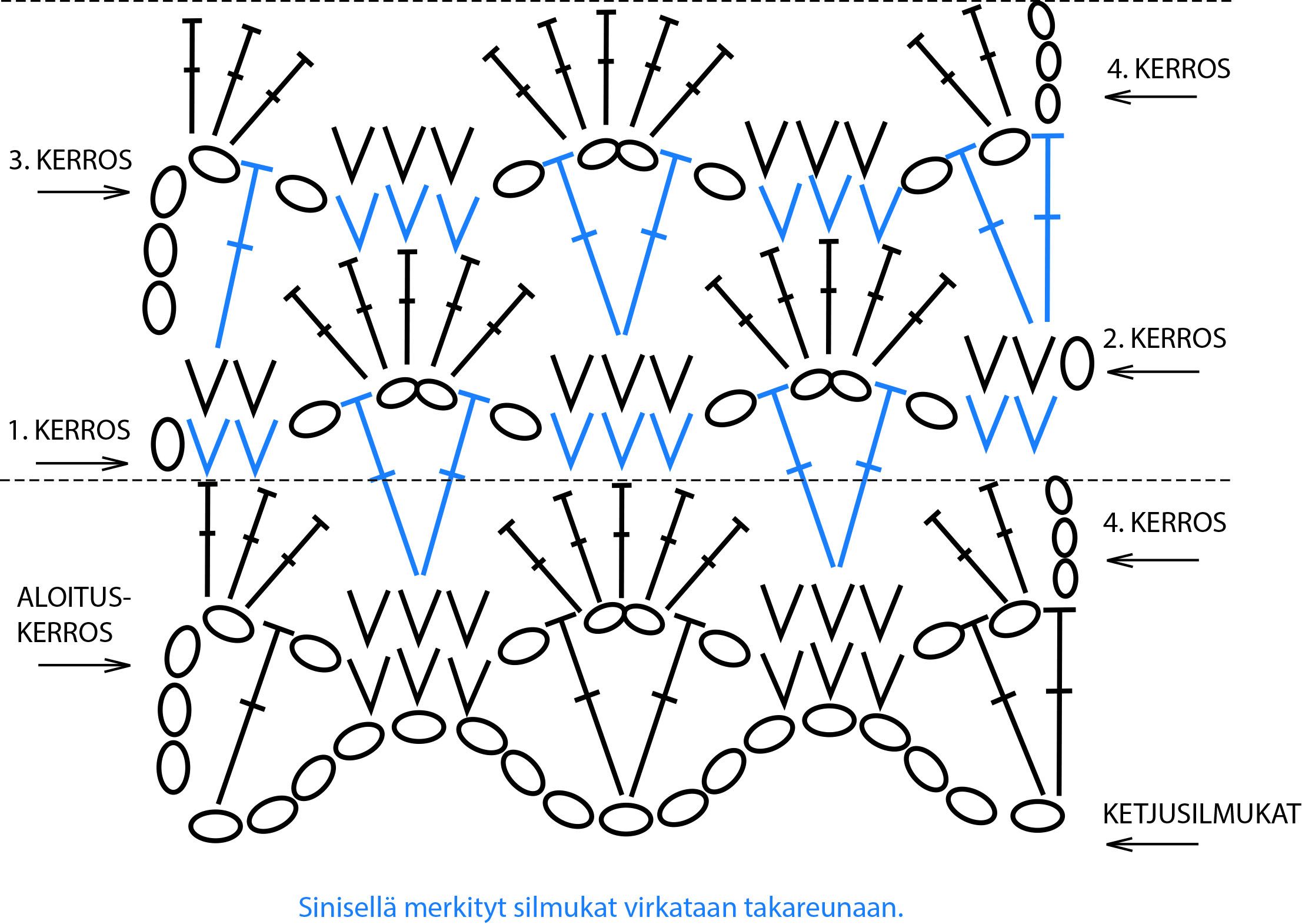 Virkkaa ketjusilmukoita 8:lla jaollinen määrä + 1 ketjusilmukka, jotta reunoista tulee symmetriset. Virkkaa 3 ketjusilmukkaa kääntymistä varten.