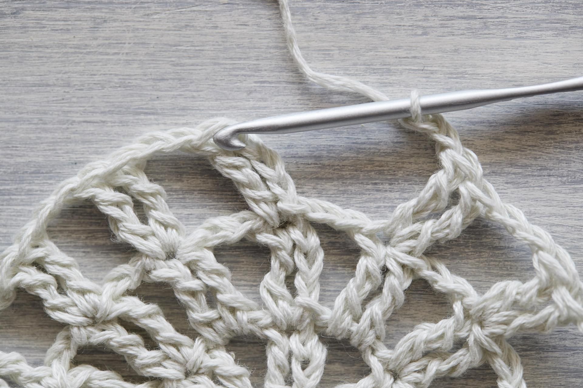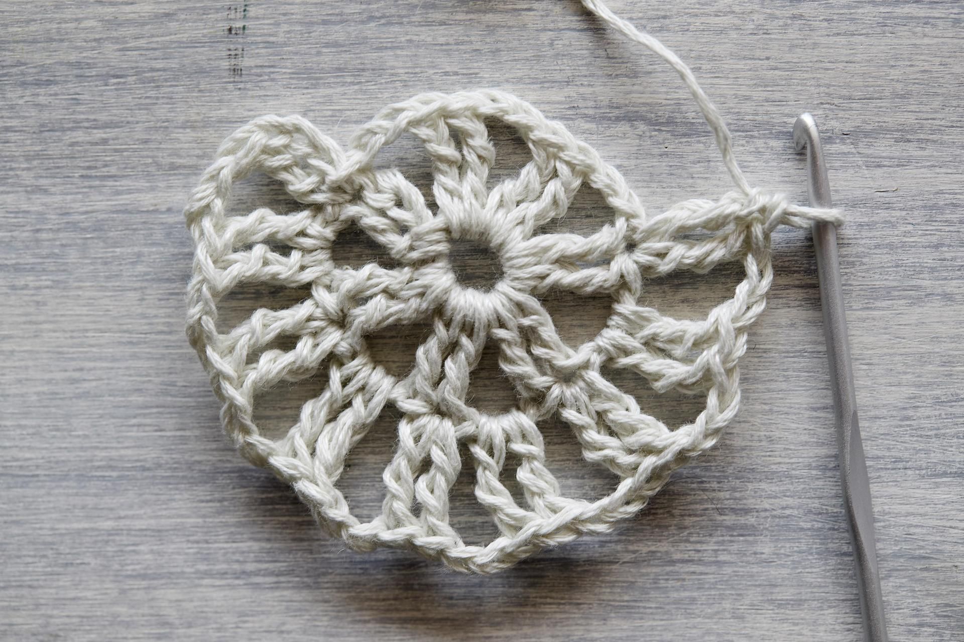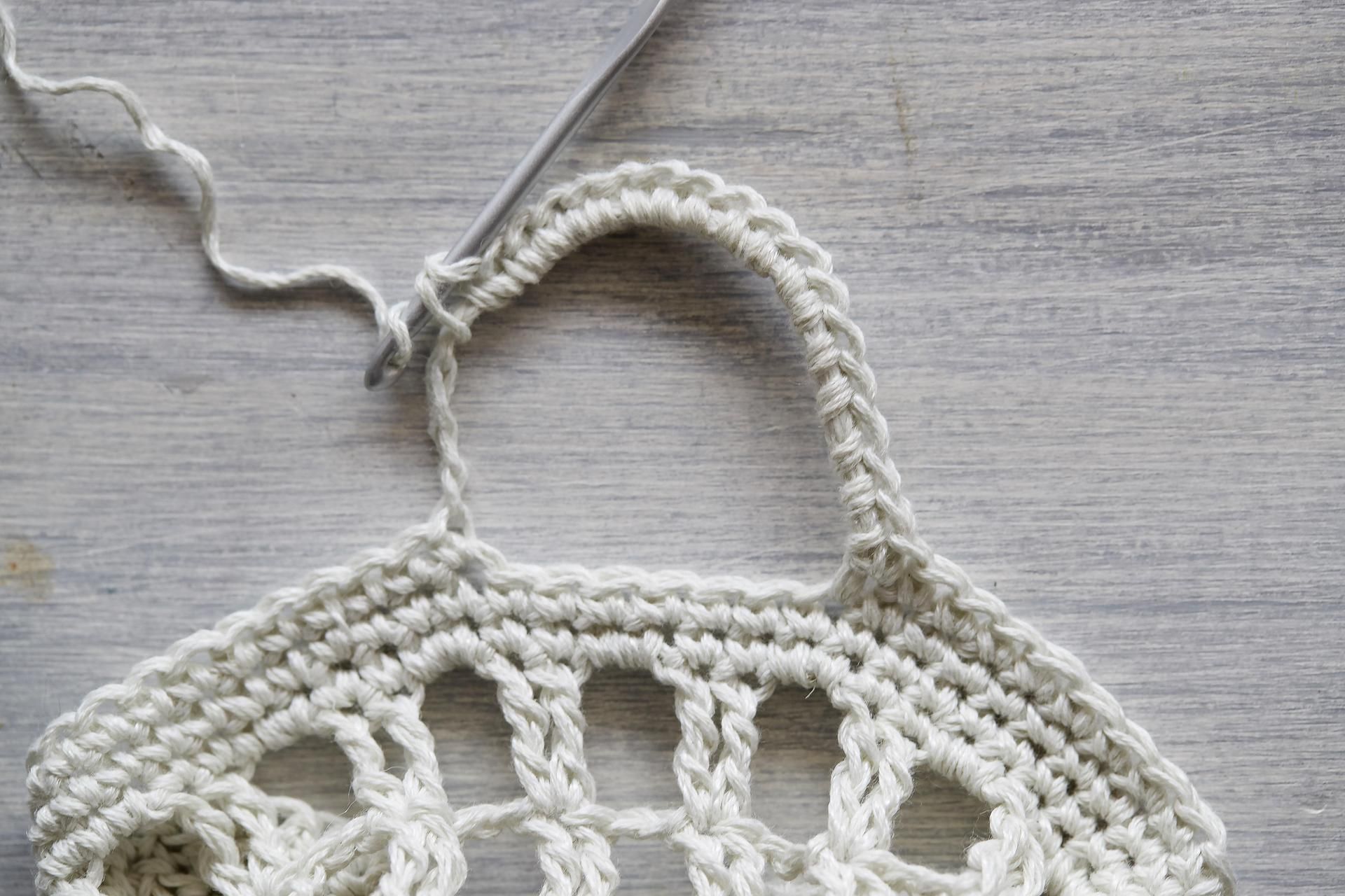 3. Virkkaa ripustuslenkkiä varten ketjusilmukoista ketju ja hyppää reunassa 6 s:n yli. Seuraavalla kerroksella lenkkiin virkataan kiinteitä silmukoita.